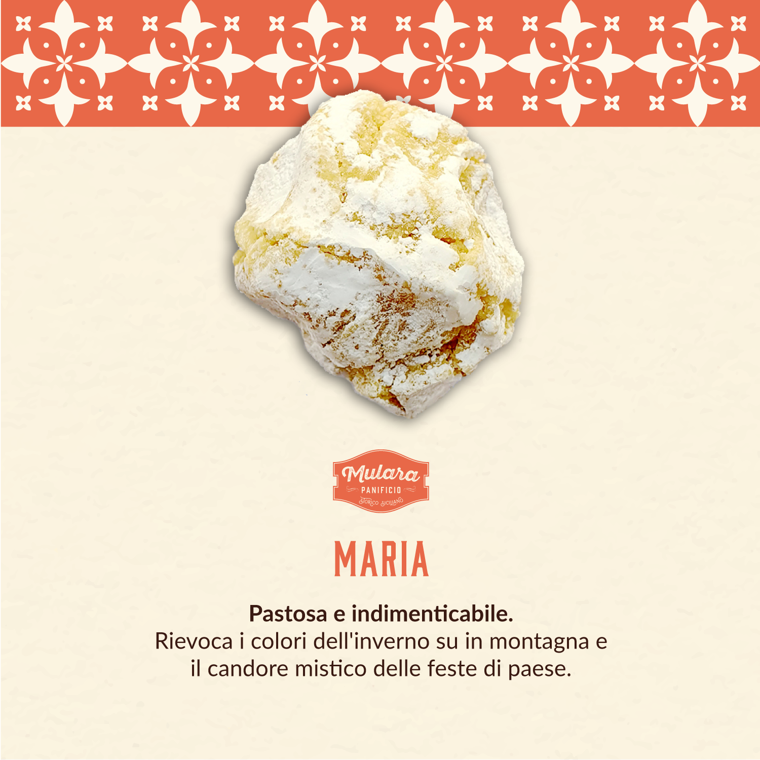 Tutta ad un pezzo, friabile e indimenticabile, Maria, con il suo manto di zucchero a velo, rievoca i colori dell’inverno su in montagna e il candore mistico delle feste di paese, quando si festeggia in famiglia, tra matrimoni e sante processioni.