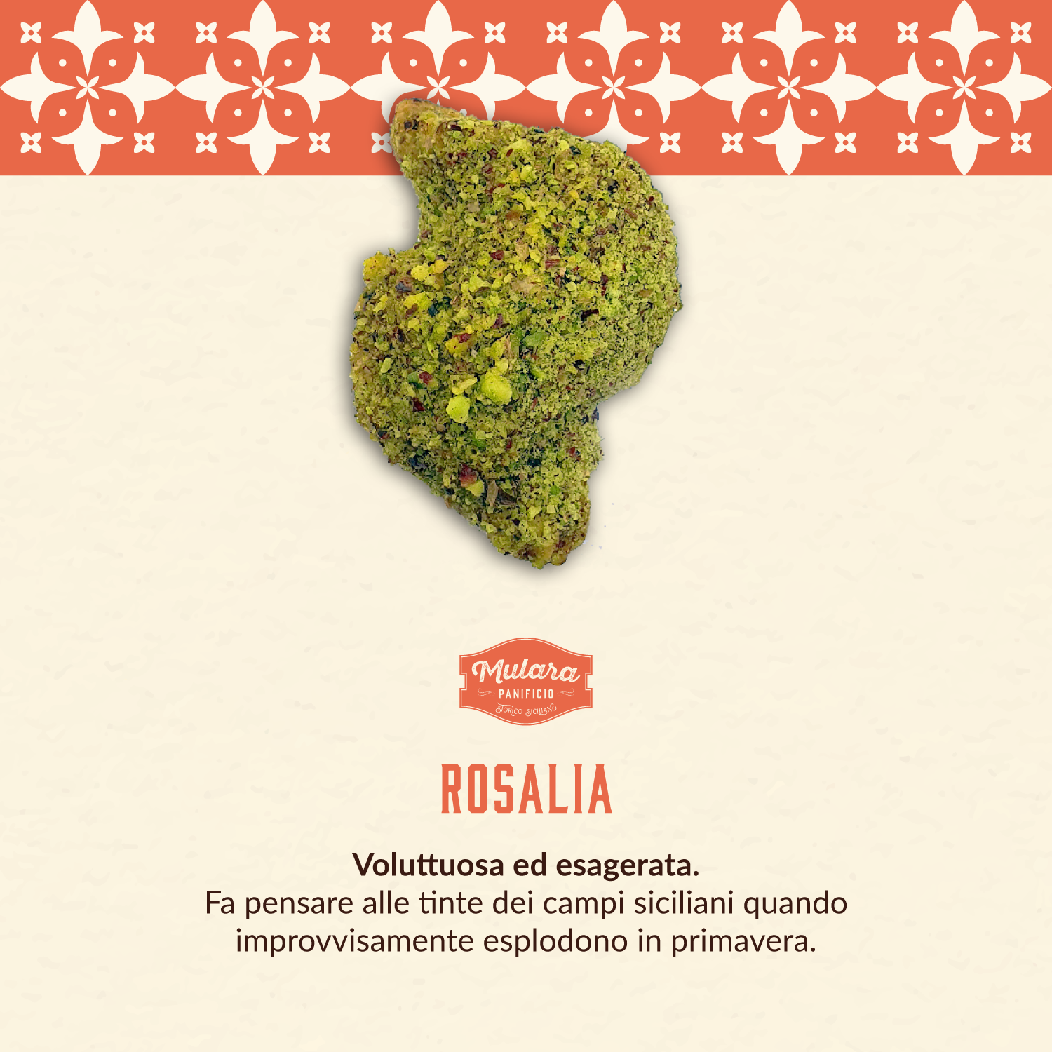 Voluttuosa, sensuale ed esagerata, Rosalia con la sua cascata di pistacchio fa pensare alle tinte dei campi siciliani quando improvvisamente esplodono in primavera.