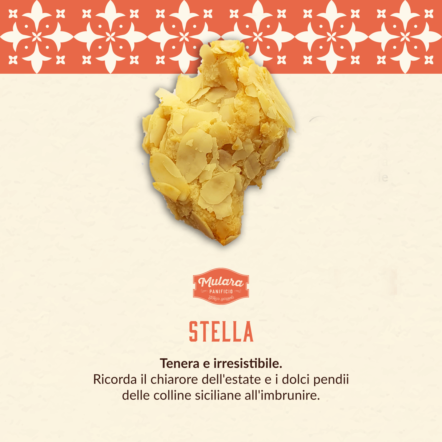 Tenera, delicata e irresistibile, con la sua cascata dorata di mandorle, Stella ricorda il chiarore dell’estate e i dolci pendii delle colline siciliane all’imbrunire, in cui lontano si riscopre il mare.